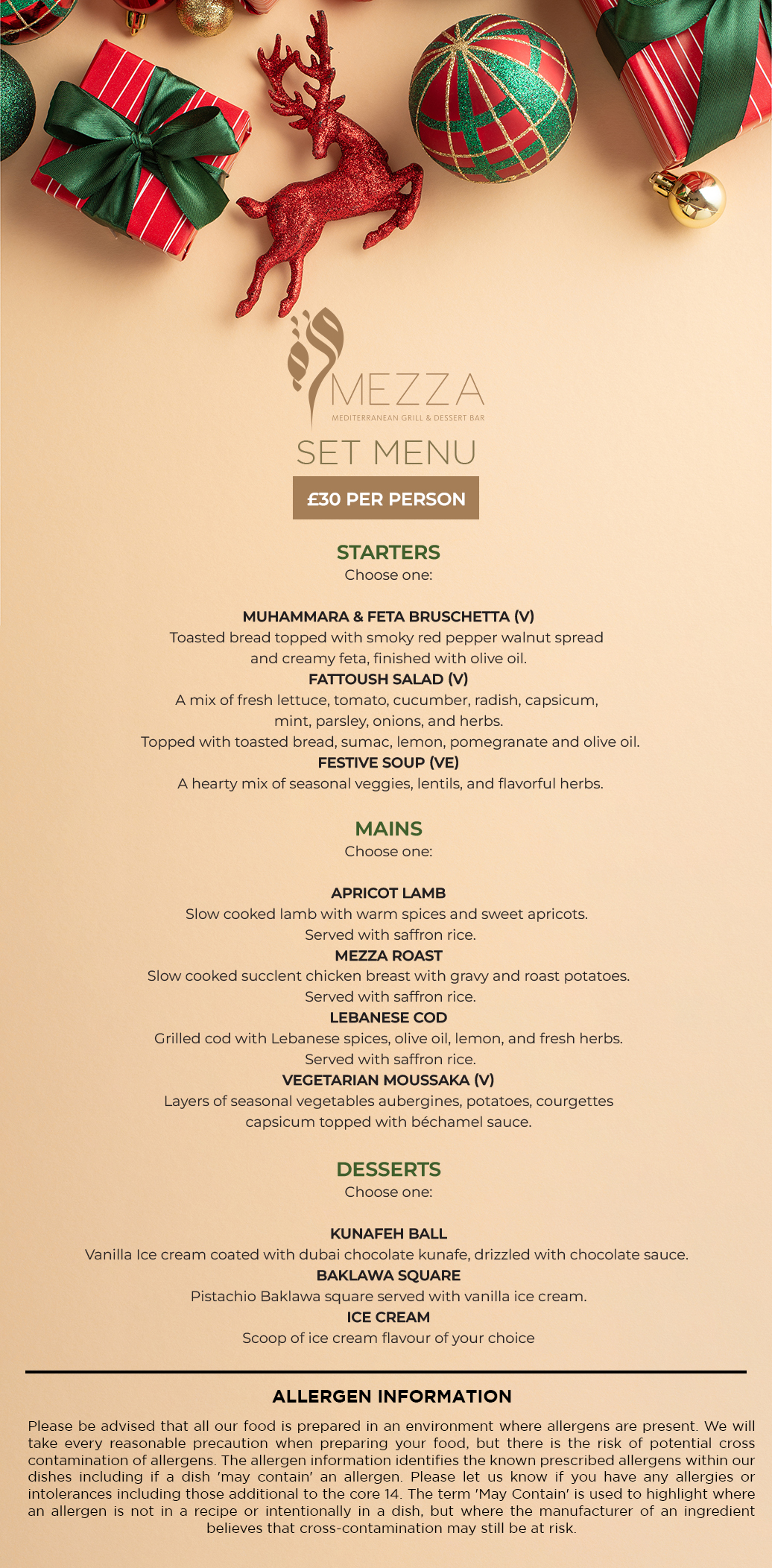 Join us for a magical Christmas season filled with delicious food, festive cocktails, and the warm glow of good company. Whether you’re planning a cosy dinner with loved ones or a lively celebration with friends and colleagues, Mezza is the perfect place to eat, drink, and be merry.